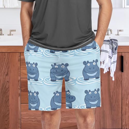 Men's Short Pajama Bottoms Hippo Cartoon Animal Blue Home Casual Sleep Pants 4