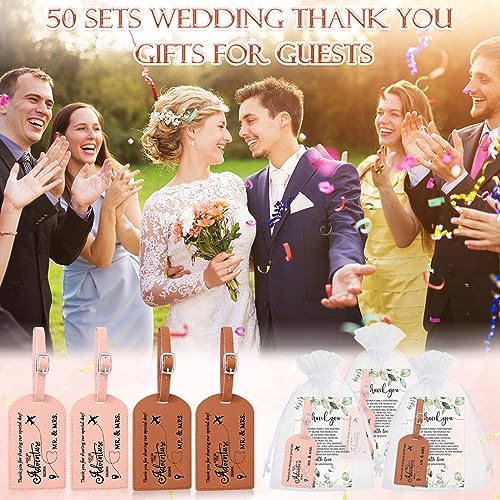 Dandat 50 Sets Wedding Favor Gifts for Guests Bulk PU Leather Honeymoon Travel Luggage Tags with Name Tel Address Cards and Organza Bags for Bridal Shower Wedding Return Gift Favors, Pink Brown 1