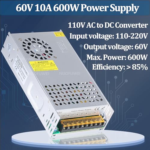 • USED WIDELY:DC 60V Power Used for Semiconductor drive, Amplifier, Radios, LED Light Strip, CCTV Camera System, Car Jack, Electronic Devices,Automation Equipment and more 60V Device. NOTE:Not suitable for charging Battery,Speed Control Motors.