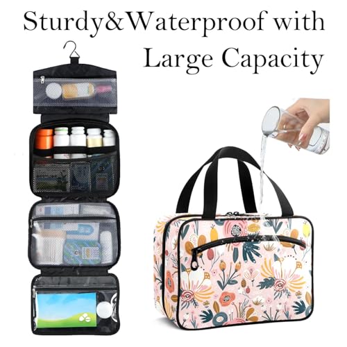 Travel Toiletry Bag for Woman/Men,Pink Floral Boho Hanging Organizer Bag with Pockets Portable Folding Travel Case Bags for Makeup Cosmetic Toiletries Storage Traveling-L 5