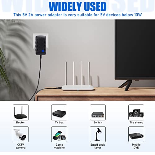 • 【Wide Applications】-- This 5V 2A power adapter is perfect for 5V devices less than 10W, such as CCTV cameras, routers, clocks, printers, LED lights, cordless phones, set-top boxes, wireless devices and more. Indoor use only