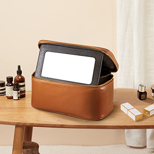 ROWNYEON Large Capacity Cosmetic Bags with Mirror for Women, Waterproof Leather Portable Toiletry Bag, Hard Shell Brushes Makeup Organizer Travel Essentials Makeup Case With Handle and Divider 6