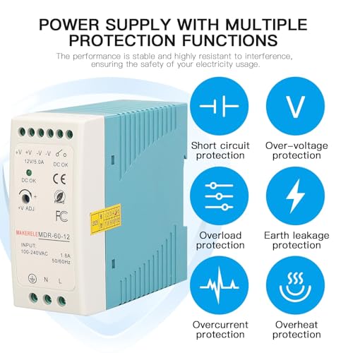 MAKERELE MDR 12V DIN Rail Power Supply 60W, Power Switching Converter AC 100V-240V to DC 12V with Overload Protection for Industrial 7