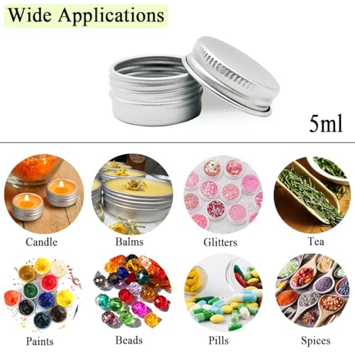 • Quantity and Size: 30 pack 5 ml / 5 gram stylish Silver screw top round aluminum tins. Diameter is about 0.98 inch and the height is about 0.59 inch (25 mm x 15 mm). Very convenient to carry in pockets, wallets, handbags, backpacks, etc.