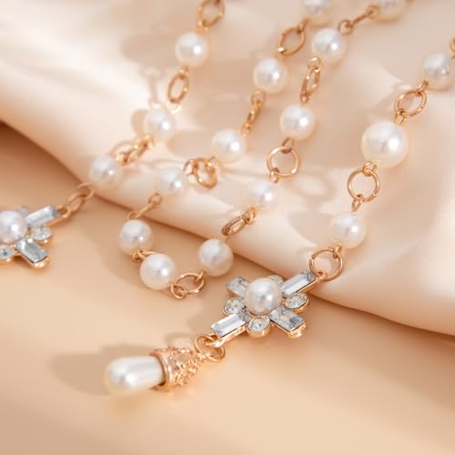 Long Pearl Tassel Chain Necklace Gold/Silver Plated CZ Cross Pendant Necklace Faux Pearl Beaded Long Chain Y Lariat Necklace Layered Pearl Cross Necklace for Women 5
