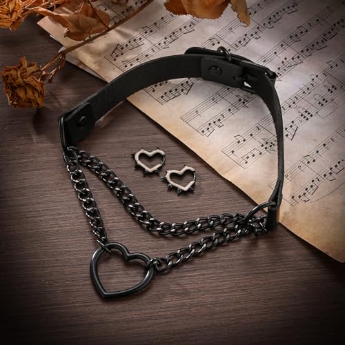 More information about Goth Heart Chain Choker Black Heart Earrings Jewelry Set Gothic Punk Grunge Emo PU Leather Necklace Y2k Huggie Hoop Spike Black Earring Jewelry Gift for Women Men