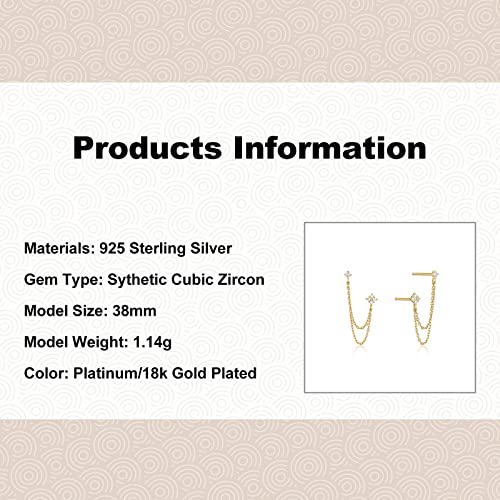 925 Sterling Silver Four Zircons Flower Stud Earrings For Women | Double Studs Chain Tassel Piercing Earring | Gold Plated Double Piercing Dangle Chain Earrings Jewelry Gifts for Women Girls 3