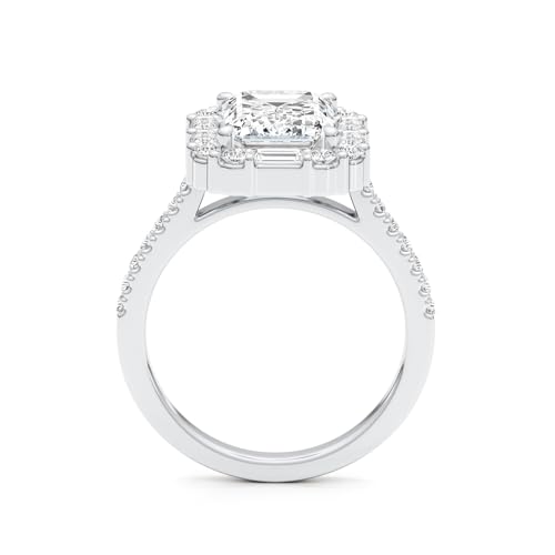 • Breathtaking Shine and Sparkle - The Moissanite center stone is emerald shape , D-E color, VVS1 clarity. Adorned with Baguette & Round shaped side stones. Total Carat Weight is 3.15.
