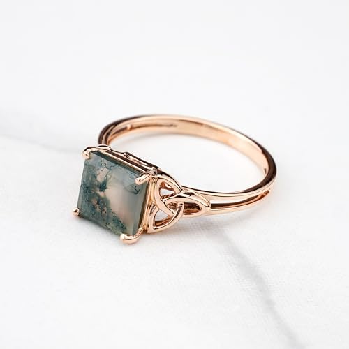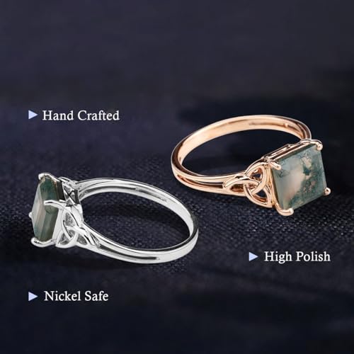 • FEATURES : Moss Agate Engagement Ring Captures The Essence of Nature's Beauty, Showcases a Magnificent Princess Cut Solitaire Natural Moss Agate Gemstone Securely Held in Place by 4 Prongs Setting, Between Two Celtic Trinity Knots Crafted in 925 Sterling Silver. The Soothing Power of Moss Agate Allows You to Feel Calm and Safe, Also Helps Draw Us Closer to Nature. Celtic Trinity Knot or Triquetra Symbolize Never Ending Love & Eternal Life.