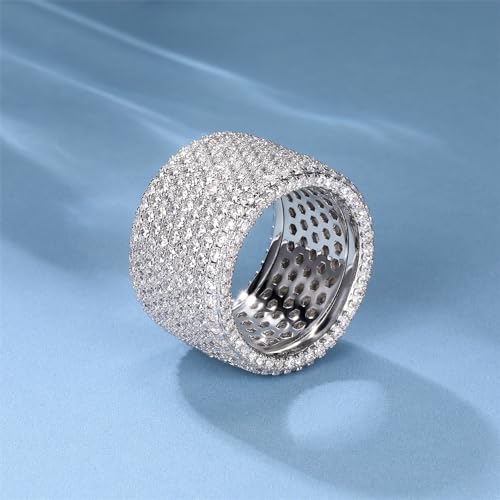 • Iced Out CZ Ring: Width 15mm, Made with AAAAA+ shiny round cut cubic zirconia and 18k white gold plated. Each ring is delicately plated in luxurious 18K white gold, imparting an opulent and radiant shine, elevating the allure of each piece.