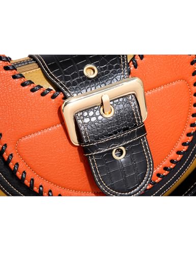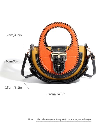 • STYLISH DESIGN: Fashion-forward handbag featuring a unique color-block design with black, red, and yellow tones, accented by decorative whipstitching and gold-tone hardware