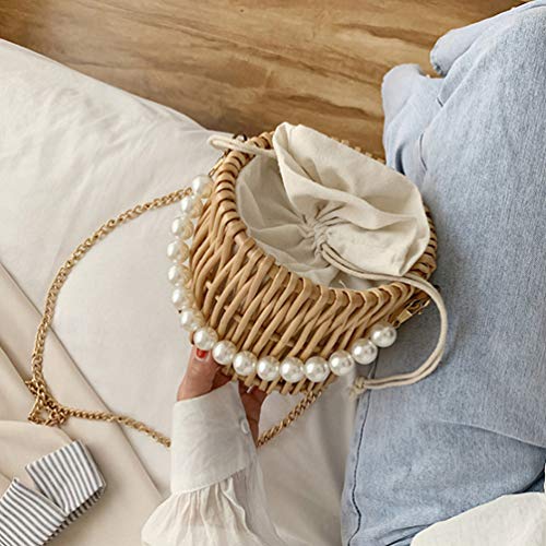 HOT ! Natural Handwoven Wicker Handbag Straw Purse for Women Pearl Hand Woven Handbag Beach Bag Wicker Summer Woven Crossbody Shoulder Bag Pearl Shoulder Bag Straw Basket Purse