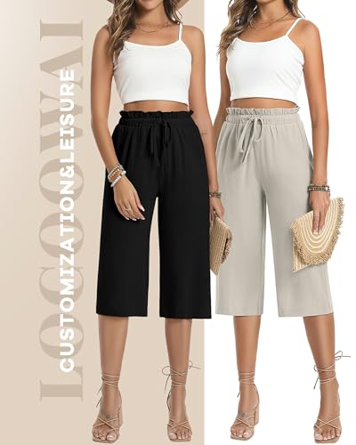 HOT ! 2 Pack Women's Wide Leg Linen Capri Pants Casual Cotton High Waist Cropped Palazzo Summer Trousers with Pockets(Black, Oatmeal,Small)