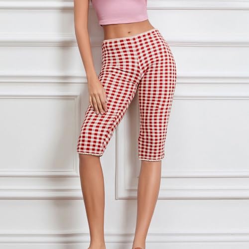 More information about Women's Gingham Capri Pants Elastic Waisted Mid Rise Vintage Plaid Pants Skinny Leggings Cropped Trousers