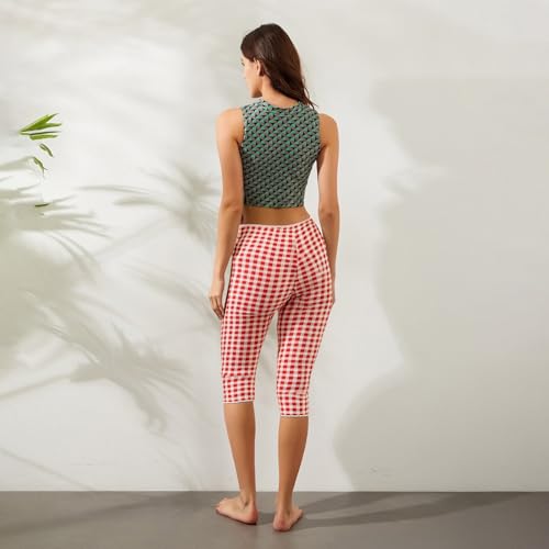 Women's Gingham Capri Pants Elastic Waisted Mid Rise Vintage Plaid Pants Skinny Leggings Cropped Trousers 7