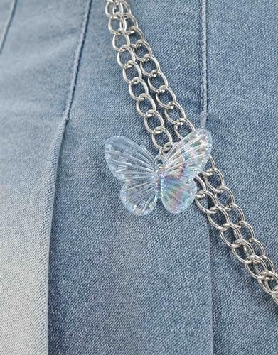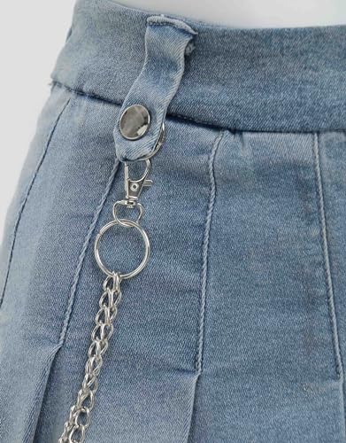 • FASHIONABLE Y2K SKIRT -- Blue denim pleated skirt featuring a detachable chain with butterflies on the side, a zipper at the back for adjusting the tightness, and an embroidery logo at the waist.