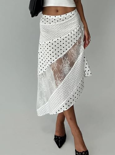 HOT ! Women Lace Patchwork Maxi Skirts Y2k Polka Dot Asymmetrical Hem Grunge Skirt Flowy High Waist Floral Satin Midi Skirt