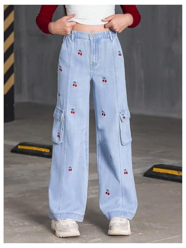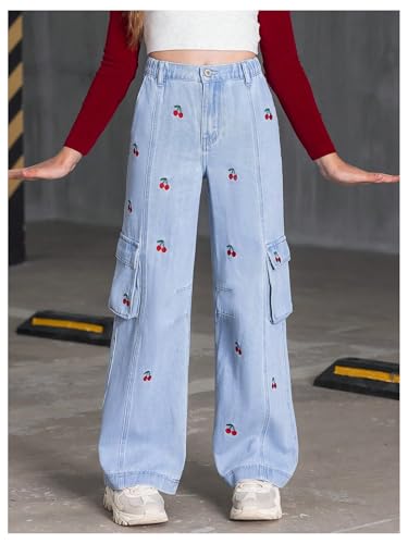 WDIRARA Girl's Cherry Print Cargo Jeans Elastic Waist Wide Leg Denim Pants with Flap Pockets 6