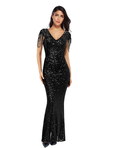 Women's V Neck Sequin Formal Evening Dress Tassel Bead Sleeve Mermaid Long Gown 1920S Party Maxi Military Dress 1