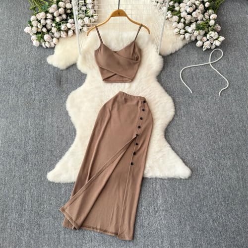 More information about Women Beach Vacation Suits Elegant V Neck Spaghetti Straps Tops High Waist Hip Wrap Single Breasted Split Skir