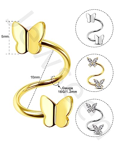 Jewseen Butterfly Twist Helix Earrings 16G Gold Cartilage Earring Lip Piercing Jewelry 316L Stainless Steel Spiral Barbell Labret Earring for Women Men 3