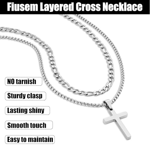 More information about Fiusem 2 Pcs Cross Necklace Chain for Men and Women, Stainless Steel Layered Mens Cross Necklaces with Pendant, Figaro and Box Chain 16-24 Inch