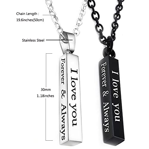 • MATCHING NECKLACE SET --- Silver and black bar pendant necklace engraved with the words promise i love you always and forever, you can give this matching necklace to your girlfriend and boyfriend, him and her, best friends, this is between you statement of Intimacy.