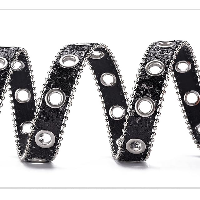 • ✦ Rhinestone Design:A row of clear rhinestones runs the length of the belt, complemented by two rows of polished silver studs framing the rhinestones.