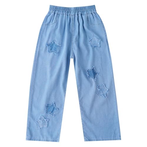 Kids Girls Star Printed Straight Jeans Wide-Leg Ripped Loose Denim Pants Trousers 6
