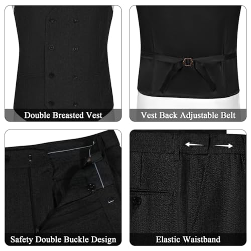 • 【Suit Details】: Herringbone Tweed Wool Suit Jacket: 2 button closure, Peak lapel, 1 breast pocket to remove inner stitches (please be careful not to cut the clothes), 2 flap pockets. Tweed Herringbone Wool Suit Vest: v-neck, single breasted buttons, 1 chest pocket, 2 flap pockets, adjustable back belt. Herringbone Tweed Wool Dress Suit Pants: Double safety buckle - zipper + button, micro-stretch waistband, 4 real pockets.