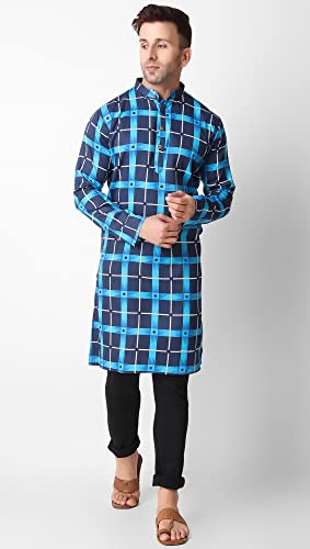 SKAVIJ Men's Printed Checkered Cotton Tunic Casual Kurta Shirt Great (Navy Turquoise, Large) 2