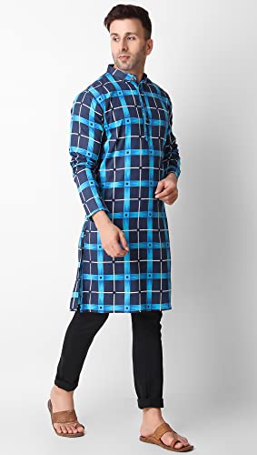 SKAVIJ Men's Printed Checkered Cotton Tunic Casual Kurta Shirt Great (Navy Turquoise, Large) 7