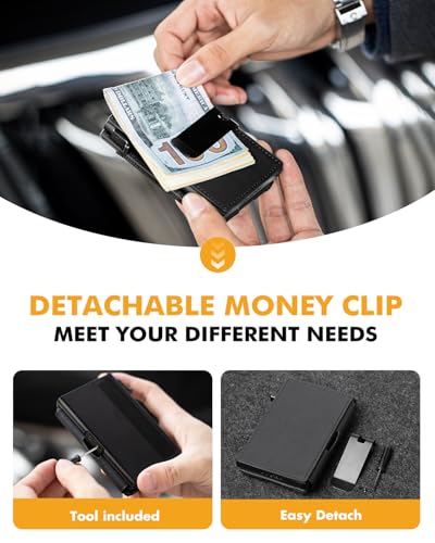 • Removable Money Clip: This men's wallet is equipped with a detachable cash clip that can easily hold 10+ bills without slipping out. With the tool included, you can attach or detach the money clip according to your usage habits, achieving a perfect balance between simplicity and functionality. Whether you are pursuing a minimalist style or need more storage space, you can switch freely, which can meet your different needs