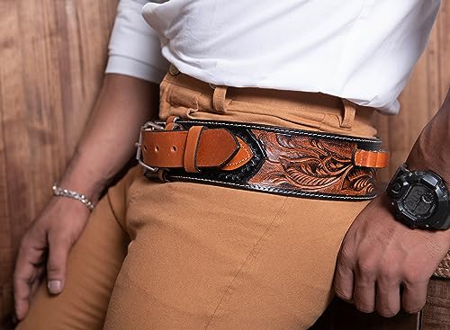 • Bullet holder belt is made up of 30-40 closed cartridge loop according to the belt size and features floral tooling on the cartridge belts for men and stitched from vegetable tanned leather.