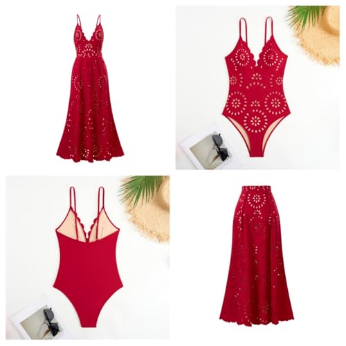 HOT ! One Piece Cheeky Slimming Bathing Suit with Long Cover-Up Skirt,Scalloped Petal Hollow Out V Neck Monokini Swimwear
