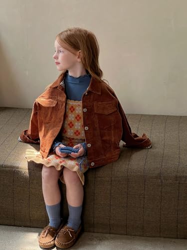 • A Kids Corduroy jacket featuring a Soft material, long sleeves, chest pocket, Fashion Contrasting Plaid Inner, Lapel, Striped Corduroy, Metal Buttons, 2 Buttoned Pockets on the Chest, Retro Color and unique design.