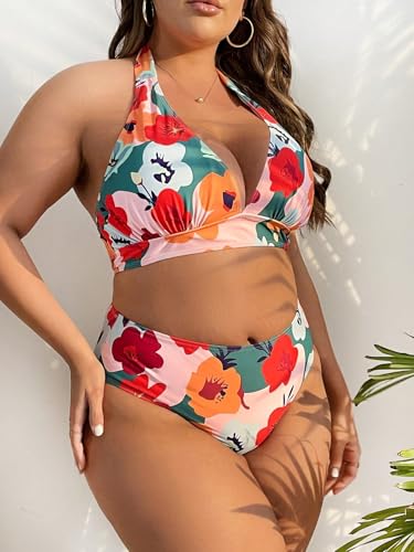 • Floral Bikini Set for Plus Size Women – This stylish plus size swimwear for women features a halter neck floral bikini top and a matching high waist bikini bottom, designed to flatter curvy figures and provide secure bust support.