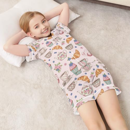 Satin Pajama Sets Short Sleeve Tea Time Sweet Treats Button Down Silky Nightwear 2 Piece PJS 5-14Y 1