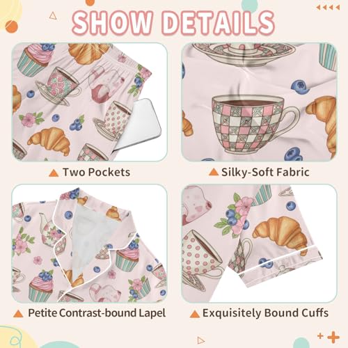 Satin Pajama Sets Short Sleeve Tea Time Sweet Treats Button Down Silky Nightwear 2 Piece PJS 5-14Y 6