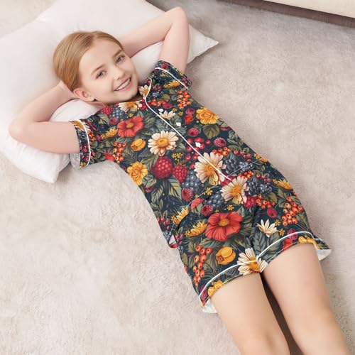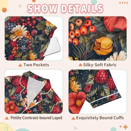 ALAZA Berry Fruit Leaf Blossom Satin Pajamas Set Short Sleeve Button Down Sleepwear Summer Pjs 2 Piece 7