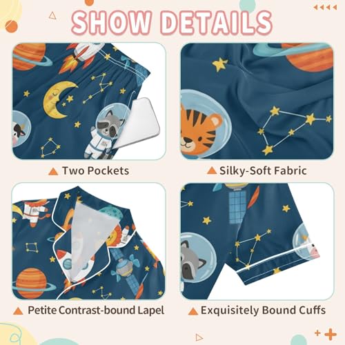 Satin Pajama Sets Short Sleeve Space Animals in Astronauts Button Down Silky Nightwear 2 Piece PJS 5-14Y 6