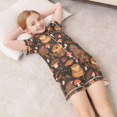 ALAZA Cute Mushroom Bear Brown Beaver Pajamas Satin Pajama Set Short Sleeve Button Down Sleepwear 7