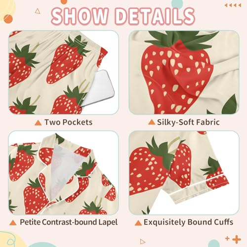 ALAZA Strawberry Red Fruit Leaf Pajamas Satin Pajama Set Short Sleeve Button Down Sleepwear 1