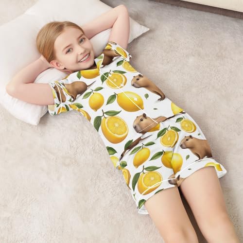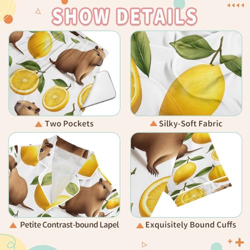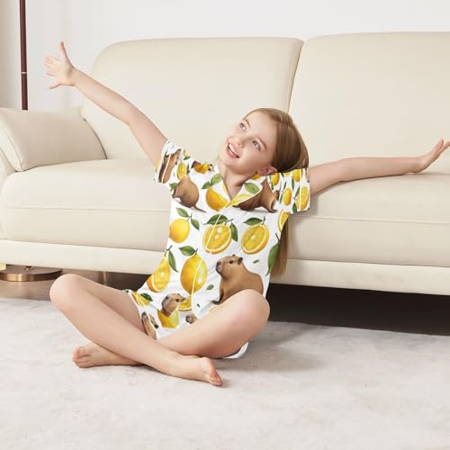 Satin Pajama Sets Short Sleeve Lemon Capybara Summer Button Down Silky Nightwear 2 Piece PJS 5-14Y 6