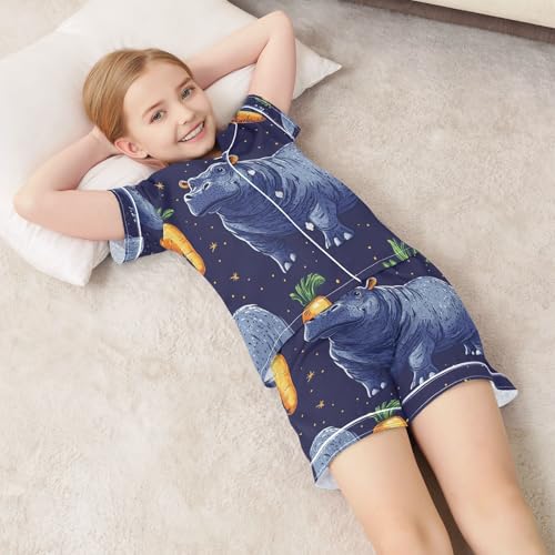 Satin Pajama Sets Short Sleeve Hippo Carrots Night Sky Button Down Silky Nightwear 2 Piece PJS 5-14Y 6
