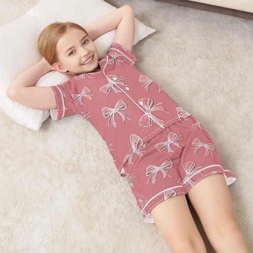 Satin Pajama Sets Short Sleeve Cute Bow Pattern Pink Button Down Silky Nightwear 2 Piece PJS 5-14Y 6