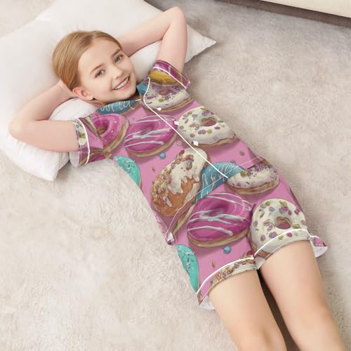 Satin Pajama Sets Short Sleeve Colorful Donuts with Sprinkles Button Down Silky Nightwear 2 Piece PJS 5-14Y 7