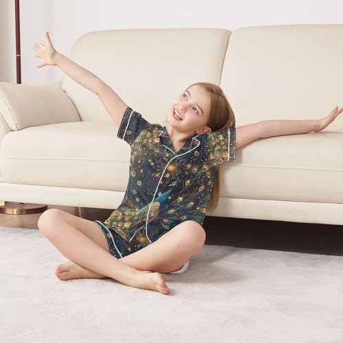 ALAZA Beautiful Peacock Starry Pajamas Satin Pajama Set Short Sleeve Button Down Sleepwear 5