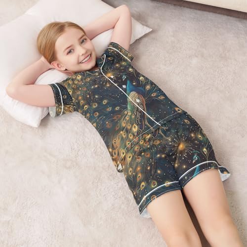 HOT ! ALAZA Beautiful Peacock Starry Pajamas Satin Pajama Set Short Sleeve Button Down Sleepwear