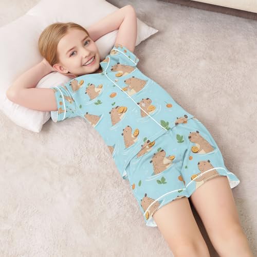 HOT ! senya Cute Capybaras Swimming Q Satin Summer Pajama Sets Silk Short Sleeve Button Down Sleepwear